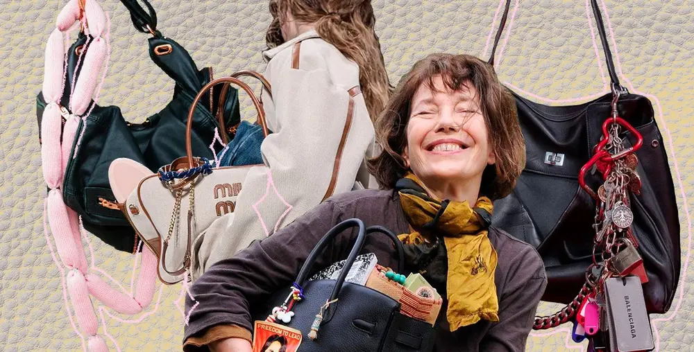 Бунтарский стиль Джейн Биркин становится трендом на сумках. Гардероб инфлюенсеров наполняются шарфами-сосисками, гребнями для волос и брелоками.